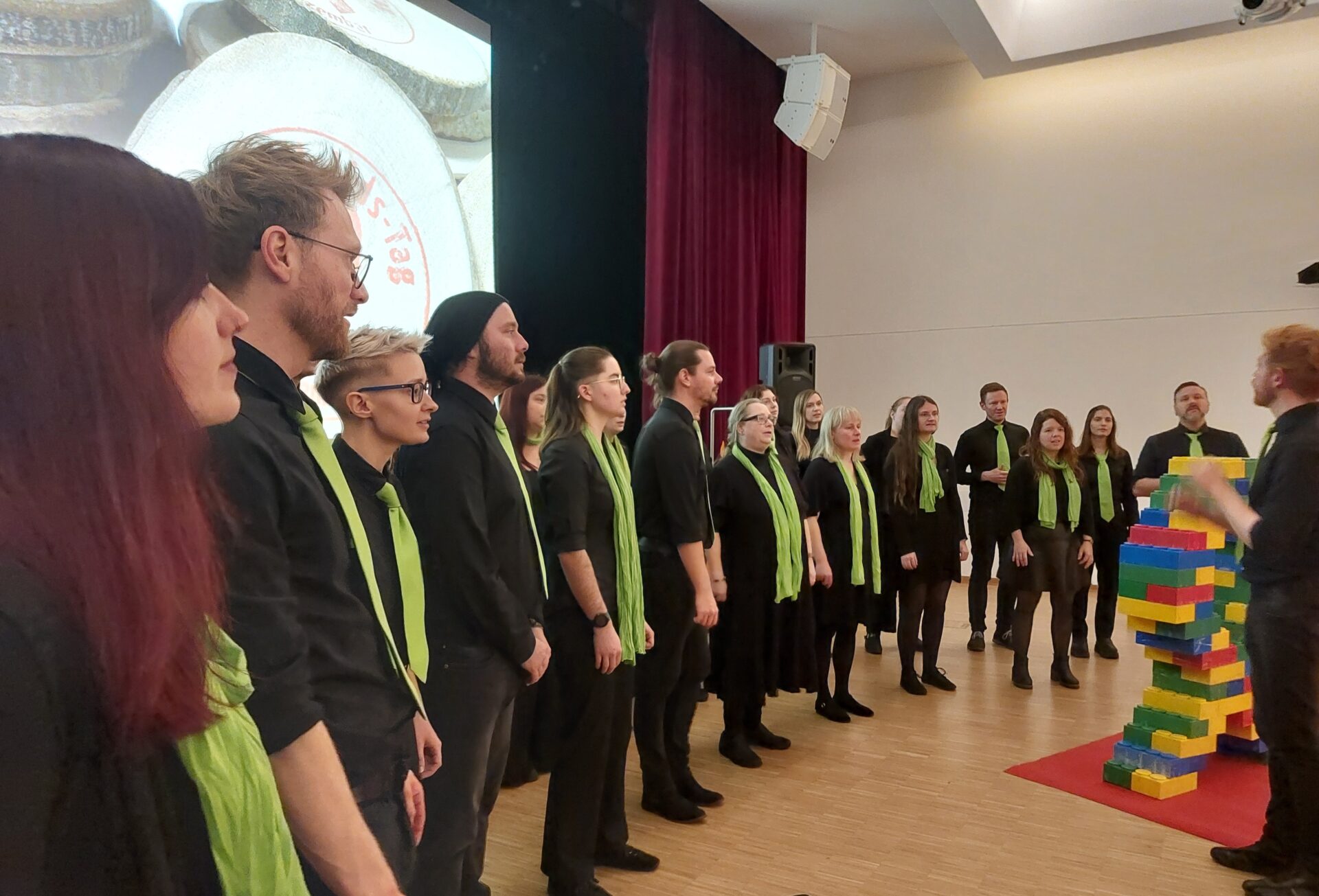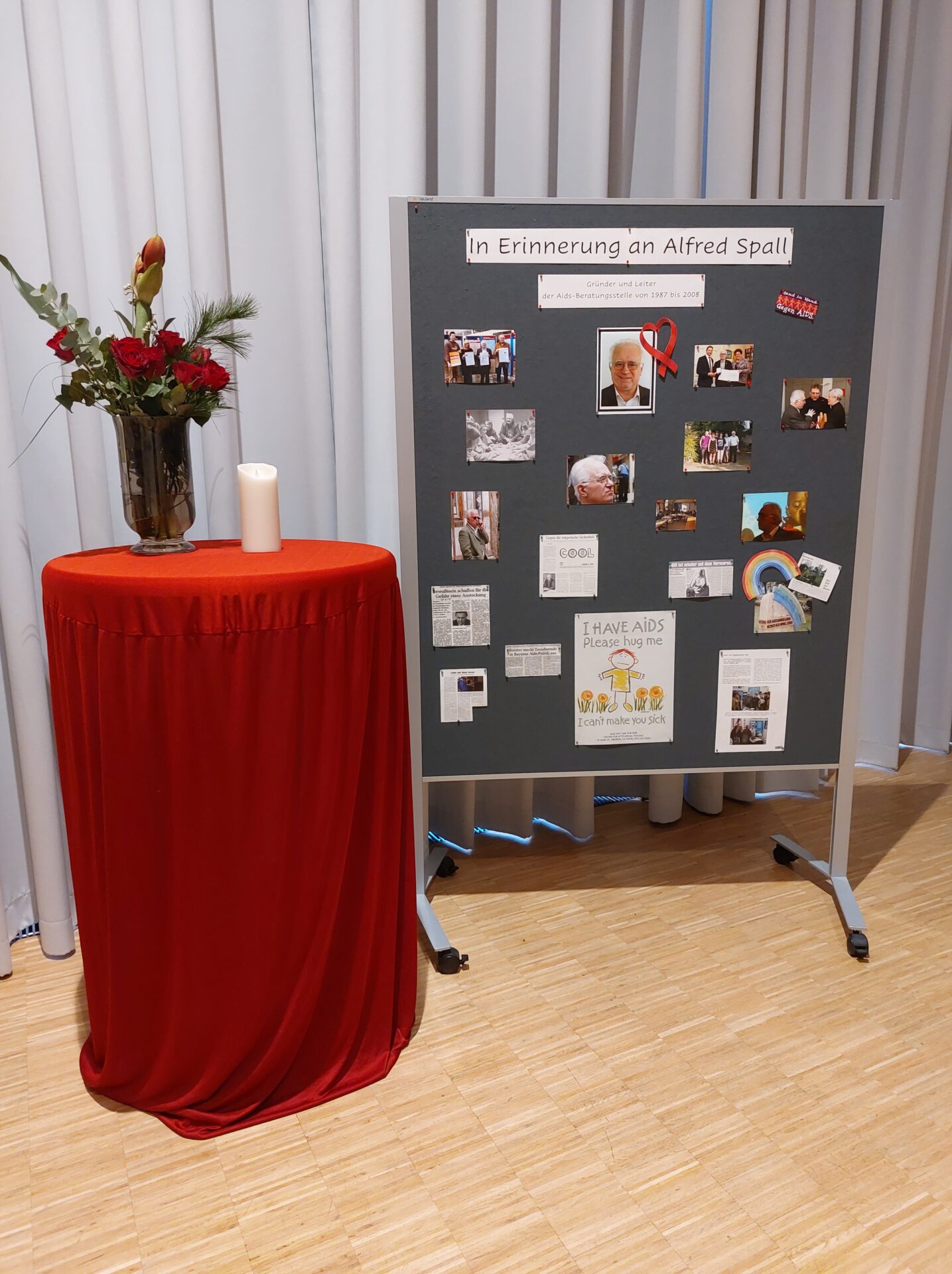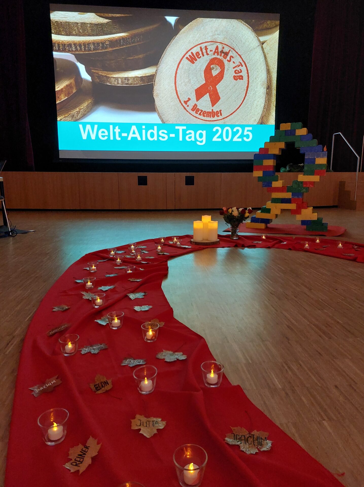Besonders bewegend waren die Stimmen und Statements, die im Vorfeld gesammelt wurden – über Social Media, bei Infoständen und in persönlichen Gesprächen. HIV-Positive, Schüler*innen und Studierende, Menschen aus Politik und Kirche beantworteten die Frage: „Was bedeutet Verantwortung in Bezug auf HIV ?“ Die Beiträge wurden in Bild, Ton und Text präsentiert und machten deutlich, wie vielfältig Verantwortung gelebt werden kann. Auch die bayerische Gesundheitsministerin Judith Gerlach schickte eine Videobotschaft und nahm Stellung zu dieser Frage. Parallel dazu entstand aus großen Bausteinen eine Schleife – das weltweite Symbol für Solidarität mit HIV-positiven Menschen. Mit dem letzten Stein wurden die Gäste eingeladen, gedanklich ihren eigenen Beitrag hinzuzufügen: „was heißt Verantwortung übernehmen für Sie und dich ganz persönlich oder in ihrer beruflichen Rolle“.
